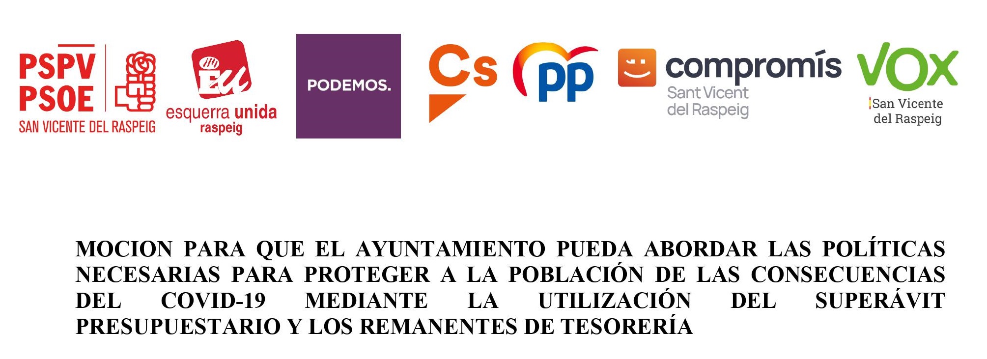 El grupo municipal de Ciudadanos (Cs) ha mostrado su satisfacción por el acuerdo alcanzado entre los siete partidos que tienen representación en el Ayuntamiento de San Vicente del Raspeig (PSOE, Cs, PP, EU, Vox, Podem y Compromís) para solicitar al Gobierno que permita destinar el 100% del superávit municipal a paliar los daños sociales y económicos provocados por el Covid-19.