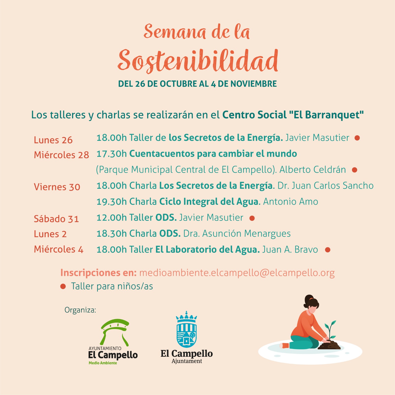 La concejalía de Medioambiente, dirigida por el edil Julio Oca (Cs) informa que todas las actividades programadas durante la “Semana de la Sostenibilidad”, que comenzaba hoy y se extendía hasta el miércoles 4 de noviembre, quedan APLAZADAS.