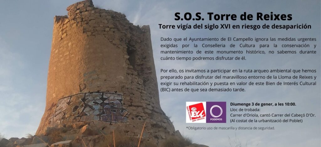 Ante la inexistencia de medidas de preservación de la Torre de Reixes por parte de el Ayuntamiento de El Campello, es el segundo año consecutivo que Esquerra Unida El Campello realiza un evento de estas características. “Volvemos a la Torre de Reixes para exigir que se adopten medidas urgentes, que garanticen primero la conservación del monumento, para más tarde plantear un proyecto que ponga en valor la propia torre y el paraje de Lloma de Reixes”, expone Juanjo Galvañ.