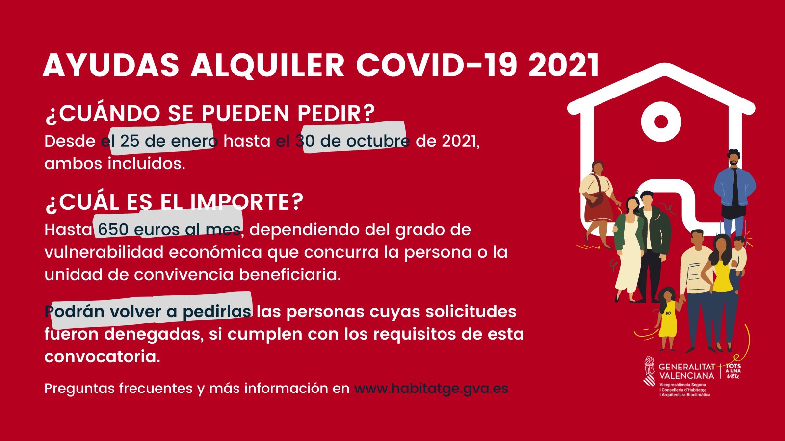 Las ayudas alquiler Covid-19 2021 ya se pueden solicitar desde el pasado 25 de enero y hasta el 30 de octubre de 2021. El importe que se puede adquirir puede alcanzar los 650 euros, dependiendo del grado de vulnerabilidad económica que concurra la persona o la unidad de convivencia beneficiaria.