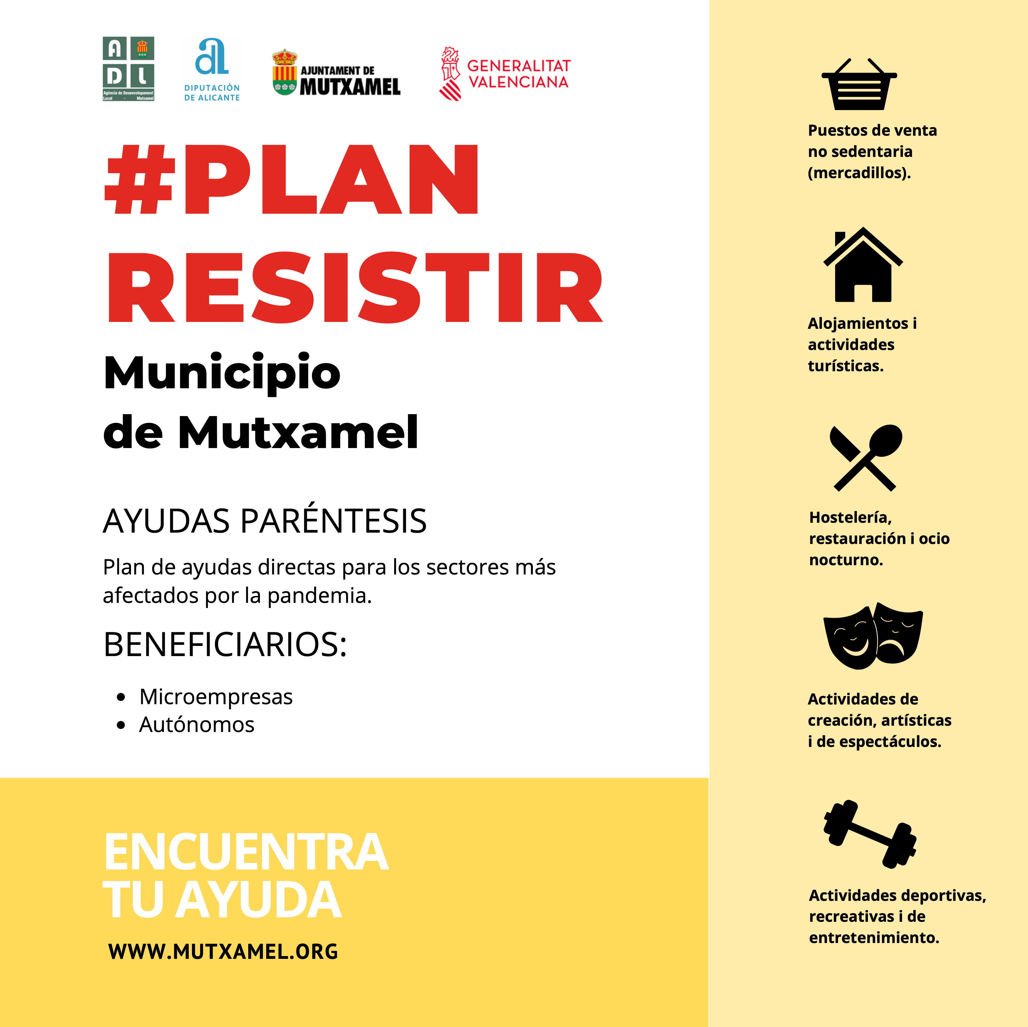El Plan Resistir aportará al municipio de Mutxamel la cantidad de 711.753€, siendo el porcentaje correspondiente a la Generalitat Valenciana de un 62.5%, ascendiendo a la cantidad de 444.845,625€, correspondiendo a la Diputación Provincial de Alicante un 22.5% ascendiendo dicho porcentaje a la cantidad a 160.144,425€.