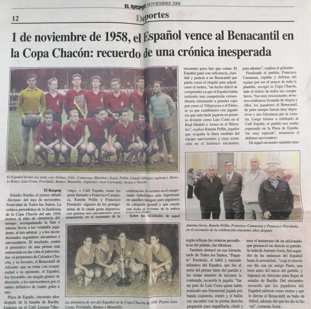 Así empezamos la mayoría de nosotros, y a partir de ahí, por afinidad, por amistad o por empatía, fuimos formando equipos para participar en torneos locales, y nuestro grupo, con el nombre de Chamartín, sugerido por un compañero del equipo gran seguidor madridista, fue el campeón. Este fue el origen de la generación de estos futbolistas que en principio estaba formado por Raimundo Lillos, Francisco Compañs, Paco Camarasa, Rafael Seguí, Paco Ferrándiz, Ramón Pellín, y otros amigos que se fueron descolgando por distintos motivos, a la vez que otros se incorporaban como Parratalá (parreta) y Manolo Pastor (Bonet). También es justo mencionar a Guijarro (Eugenín), que aunque su inicio como futbolista siguió otros caminos, compartimos con él vestuario en infinidad de ocasiones y vivimos juntos anécdotas mil, y fue el artífice junto a Juan Ferrándiz de propiciar nuestro debut en los campos de La Viña y de Bardín, para nosotros un sueño, en varios partidos de entrenamiento para enfrentarnos como sparring al Alicante juvenil de los Asensi, Pallares, Perea, Molina, etc. y que sería subcampeón de España.