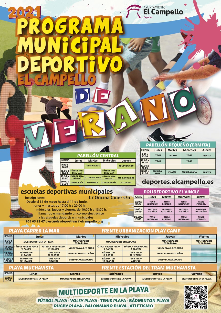 Fútbol sala, tonificación, fit-dance kids, fit-dance, yoga, pilates, espalda, iniciación tenis, tenis perfeccionamiento, pretenis, fútbol playa, rugby playa, bádminton, tenis playa, vóley playa, balonmano playa, atletismo y multideporte integran la oferta para este verano de las Escuelas Deportivas Municipales de El Campello, que ha abierto el plazo de inscripción desde hoy y hasta el 11 de junio, lunes y martes de 17:00 a 20:00 horas, miércoles, jueves y viernes de 10:00 a 13:00 horas, llamando al teléfono 965 63 22 47 o mandando un correo electrónico a las escuelas deportivas municipales (escuelasdeportivas@elcampello.org).