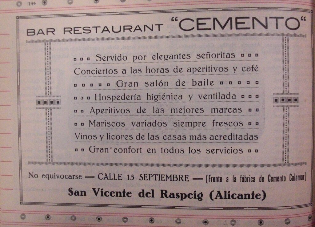 Se documenta la Tasca de Llorenset desde finales del XIX, la memoria histórica del primer republicanismo sanvicentero representado en el Café Botella (desde principio del siglo XX), la Bodegueta del Rollo, el primer bar-burdel (tipo Saloon Far West), representado por el Restaurant Cemento (desde 1929), el bar ‘matinero’ del Remolque del tranvía, entre otros.
