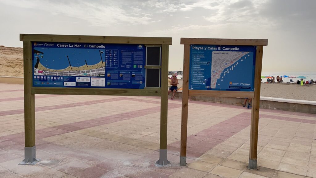 Además, leyendas explicativas con el significado de las banderas, temporada y horario del servicio de salvamento y socorrismo, prohibiciones y recomendaciones, teléfonos de interés y, como novedad, además de los puntos de interés turístico ya recogidos en los anteriores carteles relativos a la Torre de la Illeta y la Illeta Dels Banyets, Playas incorpora dos nuevos recursos de interés medioambiental: El humedal ubicado al final del trazado del río Monnegre y la ubicación de las diferentes praderas de Posidonia Oceánica.