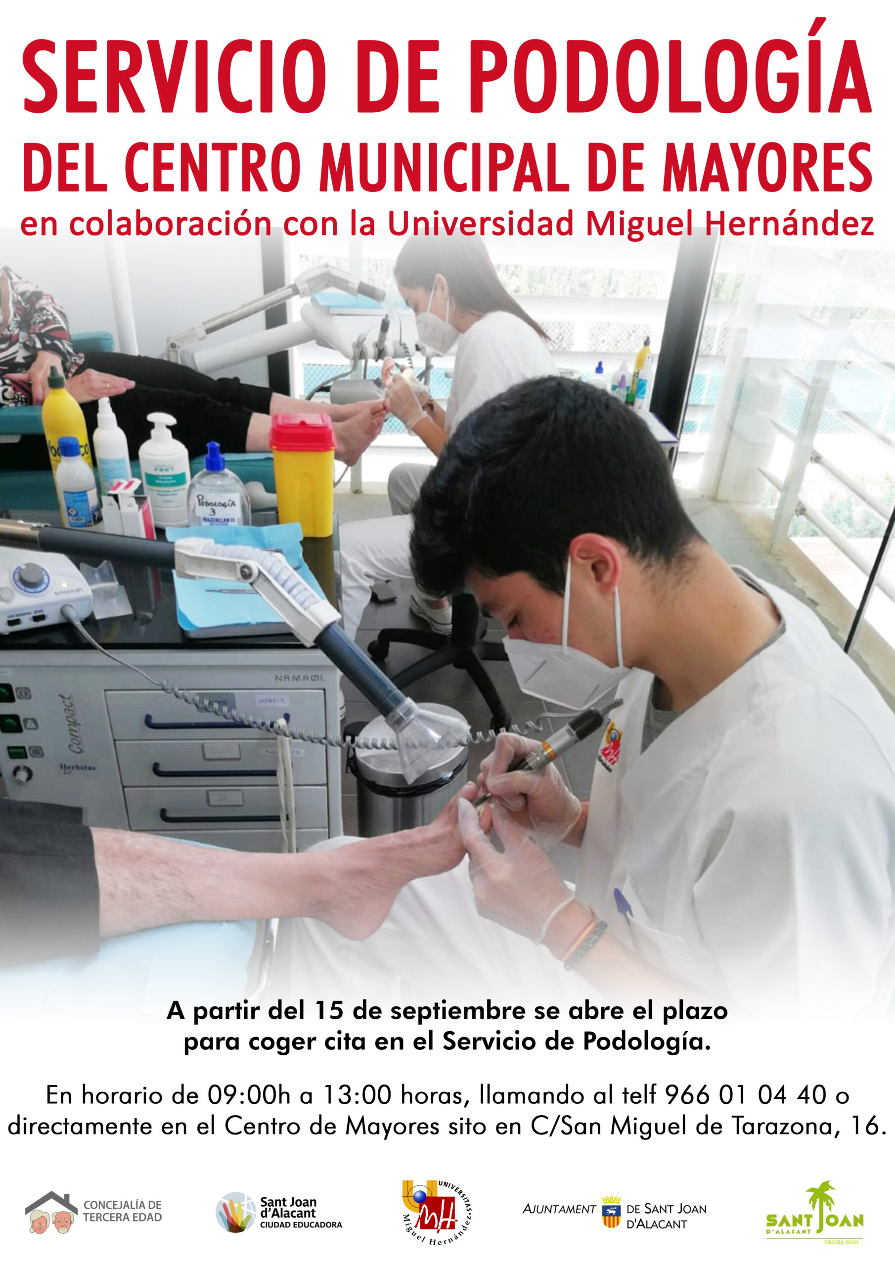 A partir de hoy ya puede solicitar su cita en el Servicio de Podología. En horario de 09:00h a 13:00 horas, llamando al telf 966 01 04 40 o directamente en el Centro de Mayores sito en C/San Miguel de Tarazona, 16.