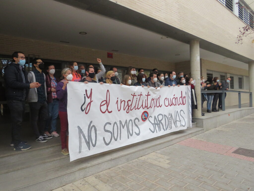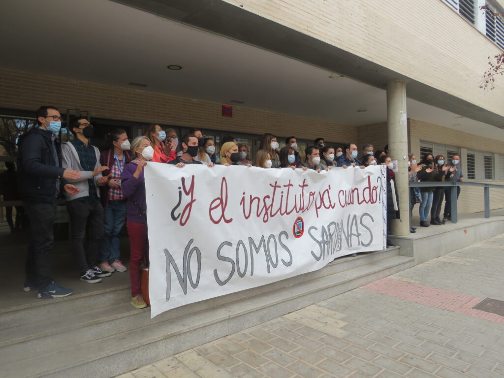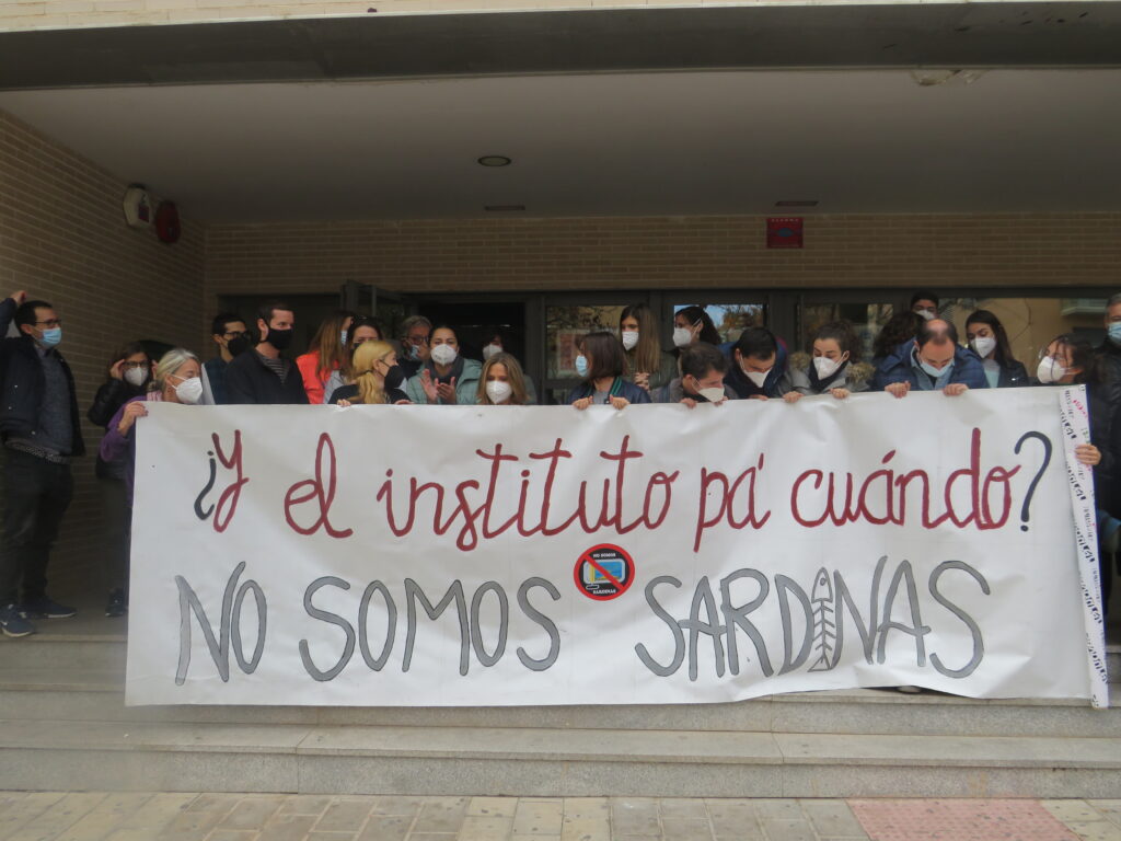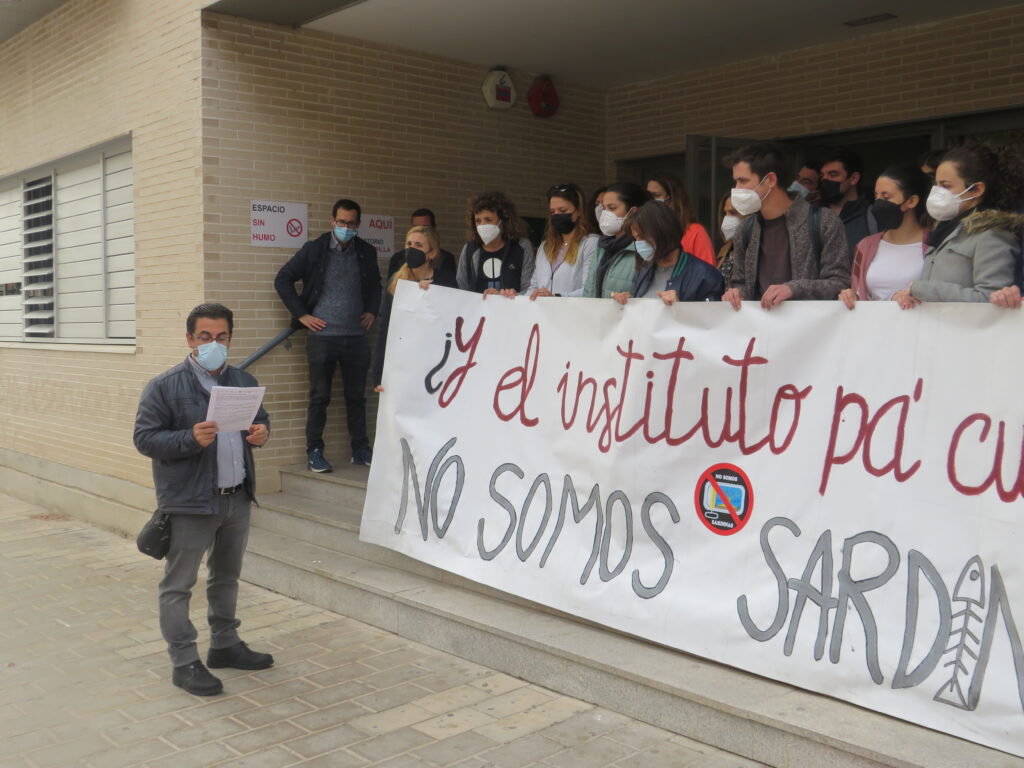 El profesorado ha salido a la puerta del centro, portando la pancarta que ayer estaba en el IES Gaia, para gritar y hacerse escuchar. Posteriormente han leído un manifiesto denunciando que “el aumento del alumnado y los problemas de espacio se han ido agravando, teniendo una capacidad para 1000 plazas y alcanzando un volumen de 1152 alumnos. Se han tenido que habilitar como aulas el salón de actos, la biblioteca y espacios previstos inicialmente para departamentos o almacenes”.