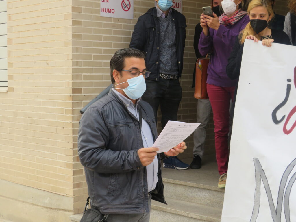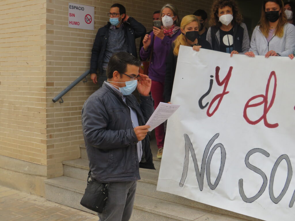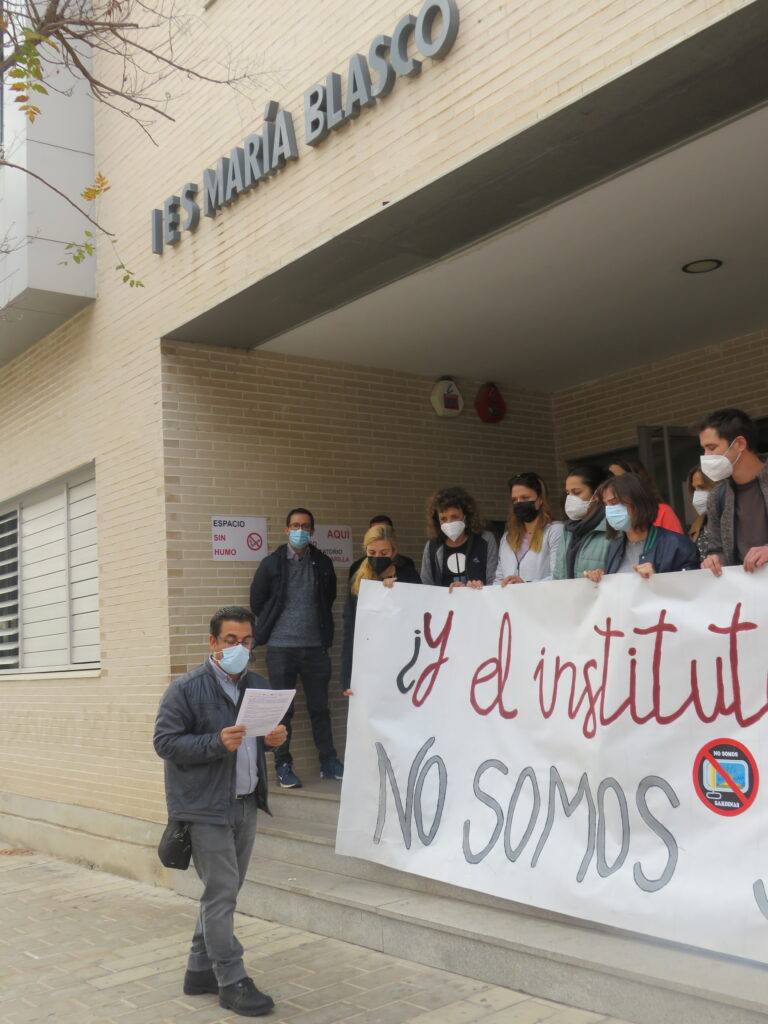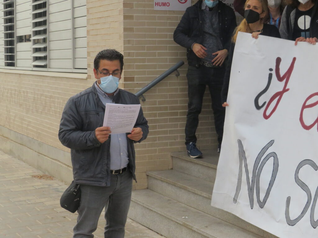 El profesorado ha salido a la puerta del centro, portando la pancarta que ayer estaba en el IES Gaia, para gritar y hacerse escuchar. Posteriormente han leído un manifiesto denunciando que “el aumento del alumnado y los problemas de espacio se han ido agravando, teniendo una capacidad para 1000 plazas y alcanzando un volumen de 1152 alumnos. Se han tenido que habilitar como aulas el salón de actos, la biblioteca y espacios previstos inicialmente para departamentos o almacenes”.