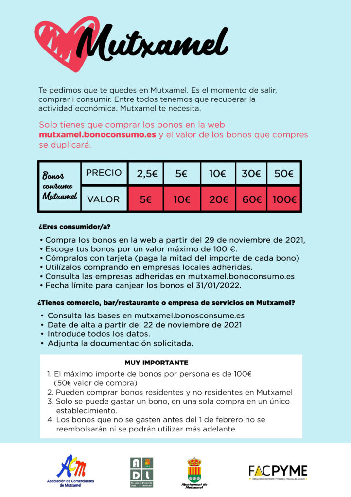 Los establecimientos que pueden adherirse son todos los que tengan su dirección en el IAE en la localidad de Mutxamel y lo podrán hacer hasta el día 31 de enero, día en el que también se acaba el plazo para utilizar los bonos.