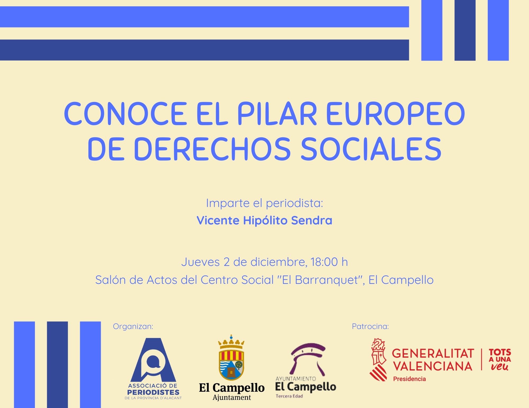 La concejalía de Bienestar Social y Tercera Edad, dirigidas por la edil Mercé Pairó (Cs), informa que el próximo jueves 2 de noviembre, a las 18:00 h, el Centro Social “El Barranquet” será el escenario de una charla con motivo del “IV Aniversario del Nacimiento del Pilar Europeo de Derechos Sociales”, impartida por el periodista Vicente Hipólito.
