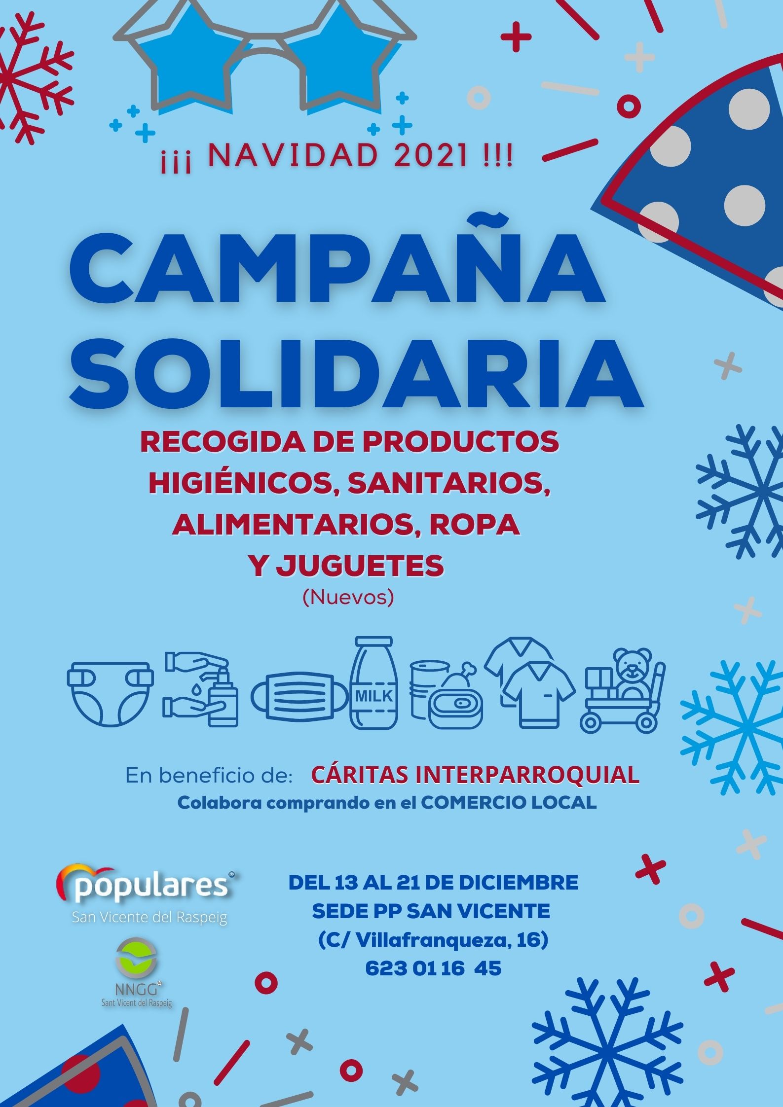 La recogida se iniciará el lunes 13 de diciembre, en la sede del Partido Popular de San Vicente, ubicada en la calle Villafranqueza, número 16, y se prolongará  hasta el martes 21 de diciembre, en horario de 17:30 h. a 20:00 h. En esta ocasión, los productos que se recogerán serán de tipo higiénico, preferentemente para los más pequeños y personas mayores. De tipo alimentario, procurando que sean no perecederos o con fechas de caducidad muy amplias. De tipo sanitario como mascarillas, hidrogeles, etc, que continúan siendo necesarios, además de ropa y juguetes. En el caso de los juguetes deberán ser nuevos, para que se entreguen con los precintos que garanticen la seguridad necesaria en estos momentos.