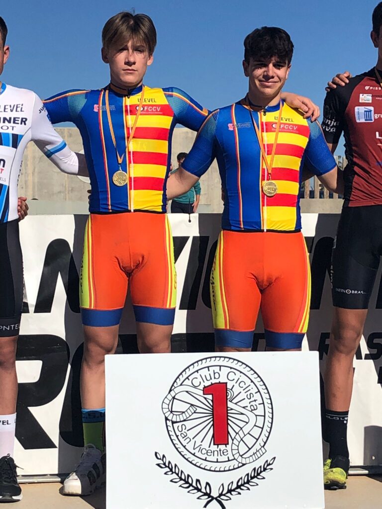 Gran resultado para el Club Ciclismo San Vicente, que proclamó ni más ni menos que a dos campeones autonómicos en la prueba cadete de Madison. Nuestras promesas de las dos ruedas Óscar Orts y Oleg Melnikov demostraron su gran potencial y dominaron la prueba con gran detemrinación. Además, la motivación fue doble ya que la prueba se disputaba en el velódromo de nuestra localidad. Óscar el sábado había corrido en Torre Pacheco (Murcia), quedando segundo durante la liga nacional de pista.