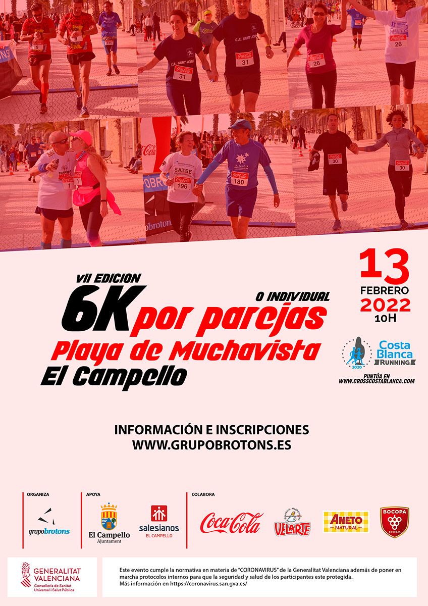 Coincidiendo con la festividad de San Valentín, la concejalía de Deportes que dirige Cristian alomares (PP), convoca la séptima edición de la popular prueba atlética “6K por parejas”, que discurrirá a lo largo de 6 kilómetros de la playa de Muchavista. La prueba, puntuable para el Cross Costa Blanca, arrancará a las 10 de la mañana, y ha sido organizada por el Grupo Brotons, organizador de efentos deportivos –https://grupobrotons.com/eventos/vi-carrera-de-los-enamorados-playa-de-mutxavista-el-campello-2022/?event_date=2022-02-13)-, que se encarga de recoger las inscripciones.