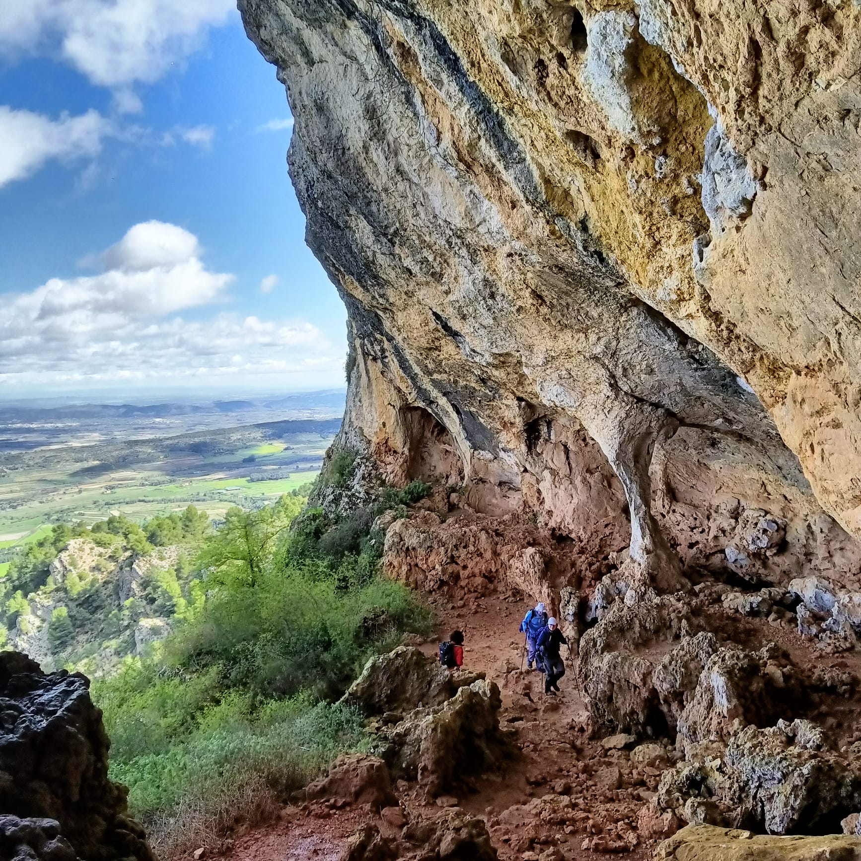 Siguieron el camino hasta la cava del Voltor, que es una de las mejor conservadas. Continuaron por una senda hasta la Cava Gran d’Agres que es arqueada y esta restaurada y es emblema del Parque Natural de la Serra Mariola. Después de observarla detenidamente y hacer algunas fotos, continuaron el recorrido bajando hasta llegar a la casa del cazador, donde comieron y repusieron fuerzas.