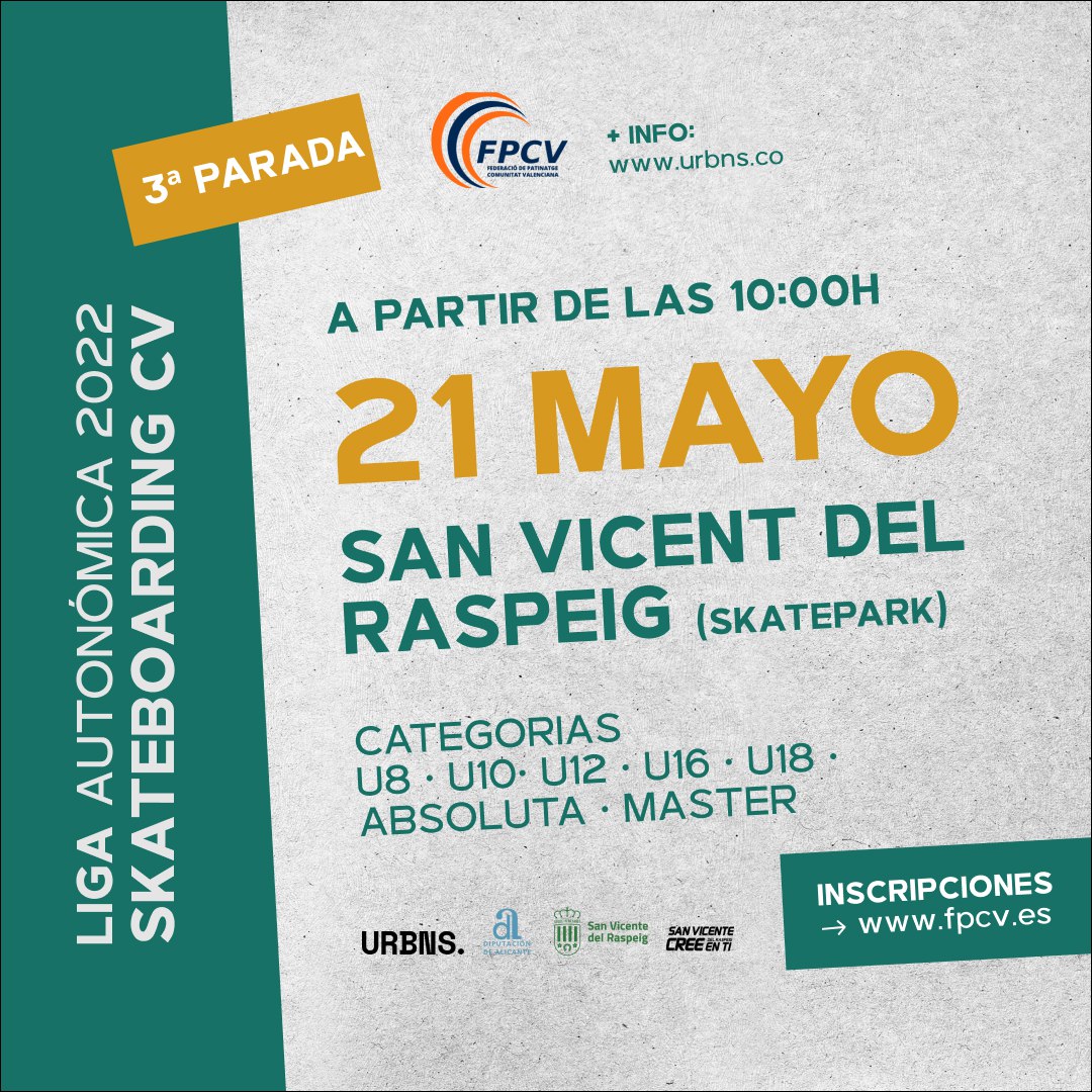 La Liga Autonómica de Skateboarding en la modalidad de Street organizado por la Federación de Patinaje de la Comunidad Valenciana en colaboración con la Concejalía de Deportes aterriza en San Vicente del Raspeig. Contará con diversas pruebas por diferentes skateparks de Valencia, Castellón y Alicante. Además, esta Liga dará acceso al torneo del Campeonato Autonómico que decidirá al representante de la comunidad, tanto femenino como masculino, en el Campeonato de España.