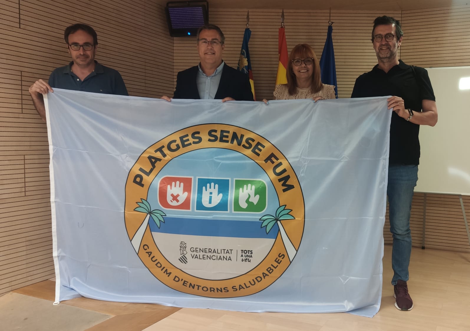 Las concejalías de Playas y Bienestar Social, dirigidas por el primer teniente de alcalde Julio Oca (Cs) y la edil Mercé Pairó (Cs), respectivamente, han viajado hasta Valencia donde han recogido sus 12 enseñas acreditativas de la adhesión de nuestro municipio a la red “Playas sin humo”, revalidando así su apuesta por generar espacios saludables por tercer año consecutivo, para sus 23 km de litoral, siendo pionera y situándose a la cabeza de todos los municipios de la Comunidad Valenciana con mayor número de playas incluidas en esta red saludable.