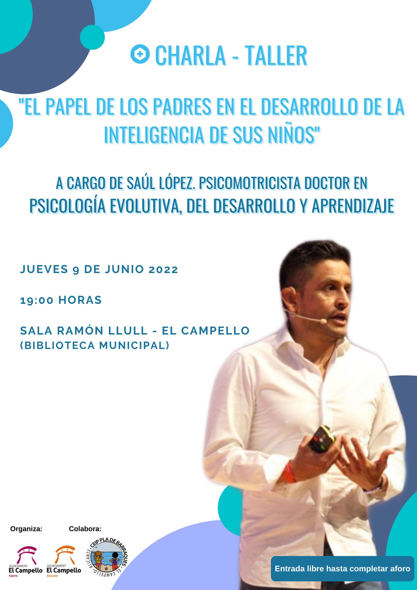 A cargo de Saúl López, psicomotricista, doctor en psicología evolutiva, del desarrollo y el aprendizaje, el jueves tendrá lugar una charla-taller en la sala Ramón Llull de la Biblioteca Municipal, organizada conjuntamente con las concejalías de Educación y deportes y con la colaboración del colegio público Pla Barraques.