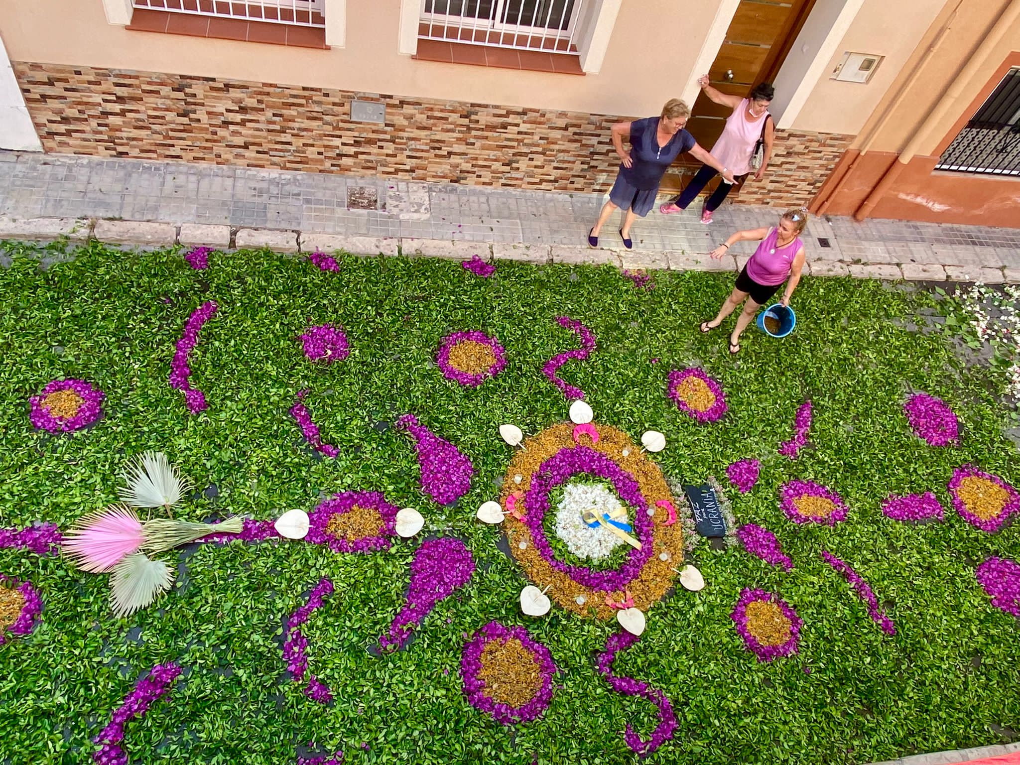 El evento destacó por el enorme manto de flores elaborado por los vecinos de las calles por las que discurría la comitiva, que dispusieron una decoración muy elogiada por el resto y también decoraron los balcones. Entre los colaboradores, los integrantes de la Cofradía del Santo Entierro, que abrió su sede de la calle Mayor y decoró la calle con un dibujo alegórico de la Comunión. Los voluntarios de Cáritas también se movilizaron, como hacen siempre en esta procesión.