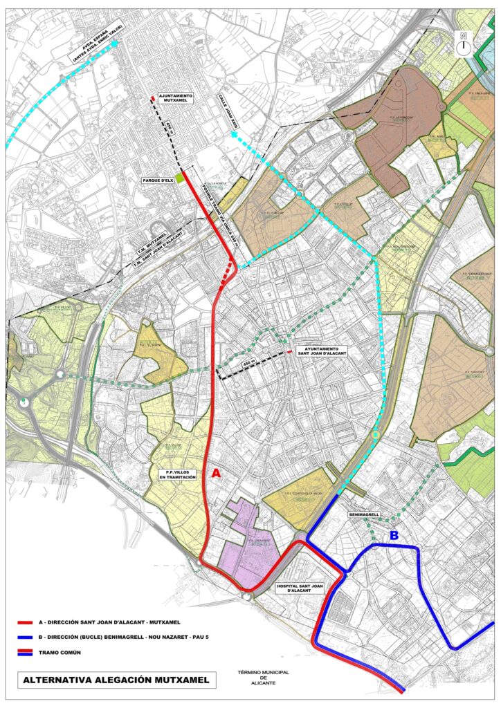 Por un lado, aclarar que nosotros no nos oponemos a que el tranvía llegue a Nou Nazaret y el PAU 5 pero entendíamos que con el paso por estas zonas, se alargaría mucho más la llegada a Mutxamel. En el propio estudio informativo de Sant Joan se establecían unos tiempos de entre 43 y 46 minutos llegar Benimagrell tras recorrer PAU 5 y Nou Nazaret. Si a esto le sumamos, sin saber todavía el trazado, digamos unos 10 minutos más para llegar de Benimagrell a Mutxamel, estamos hablando de 53-56 minutos de tranvía para bajar al centro. Un TRAM con esos tiempos no es la solución a la movilidad del municipio por lo que hemos planteado retomar la opción inicial, subir por pintor Pérez Gil, entrar por el Hospital y doblar hacia Benimagrell y ya de ahí plantear una bifurcación, con una línea que suba al centro de Sant Joan y Mutxamel y otra que haga el recorrido de Nou Nazaret y Pau 5 al estilo del bucle que se hace hoy en día en la playa de Sant Joan. Eso mejoraría los tiempos de espera. Planteamos también para esta línea hacia Mutxamel, que tras pasar por Santa Faz, se aproveche el desarrollo inminente del sector Villós de Sant Joan para incluir ese tramo para que, sumado a una modificación de la ronda norte de Sant Joan, en el tramo ya urbanizado que pasa frente a la Policía Local de Sant Joan, tenga cabida la plataforma tranviaria. Cierto que este último punto sería uno de los de mayor dificultad, pero entendíamos sería una gran ventaja que el Tram llegara a la rotonda Víctimas del terrorismo y subiera hacia el Parque de Elx de Mutxamel, quedándonos a escasos 450 m. de nuestro Ayuntamiento, es decir, habíamos llegado prácticamente al centro de la población. El tercer punto a tener en cuenta es que en las versiones anteriores pseudoficiales que vieron la luz de aquella manera, hablaban de que el tranvía vendría a Mutxamel a través de la Avenida de Ansaldo y tendría que cruzar la autovía por donde actualmente se están ampliando las salidas de emergencia por lo que complicaría aún más el paso del tranvía. Pensamos que la única opción para cruzar a Mutxamel es el paso que existe actualmente que es el paso por la carretera que conecta Mutxamel por Sant Joan. Por eso nuestra propuesta no ha sido pensada caprichosamente solo buscando la manera más rápida de llegar al centro. Creo que esta propuesta está bastante estudiada y meditada, aunque insisto, nosotros no somos los técnicos ni expertos en este tema.
