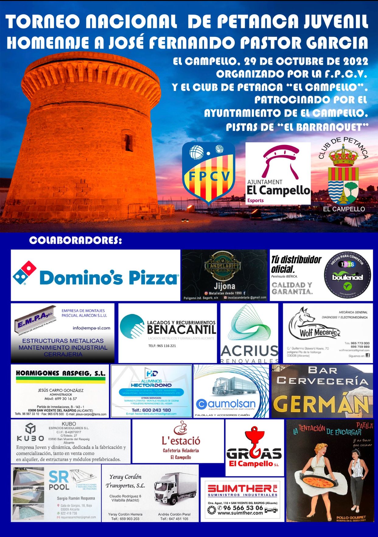 Organizado especialmente para homenajear la figura de Fernando Pastor García, mañana día 29 de octubre se celebra en las pistas junto al Centro Social El Barraquet de El Campello un torneo nacional de petanca juvenil, en el que participarán 16 parejas que jugarán bajo el sistema suizo internacional, a cuatro partidas, a 13 puntos o un tiempo máximo de 40 minutos.
