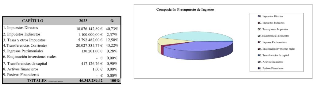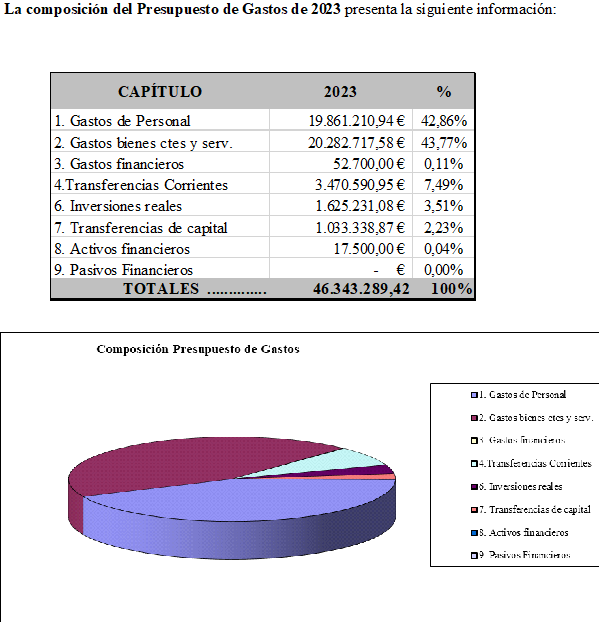 El presupuesto total del Ayuntamiento para 2023 asciende a 46.343.289 euros, con un aumento del 2,68 % respecto a las cuentas del año 2022. Para 2023 se mantiene la suspensión de la regla de gasto y otras reglas fiscales. Esto, unido a la solvente posición económica del Ayuntamiento y no tener deuda financiera, permitirá, una vez practicada la liquidación del ejercicio 2022, aplicar, vía modificación de crédito, el remanente de tesorería para gastos generales. Por tanto, pese a que el documento económico contempla una reducción del dinero destinado a inversiones (para poder hacer frente al gasto energético, que se ha triplicado) la realidad es que en 2023 el Ayuntamiento dispondrá de más fondos que en 2022 para este capítulo.