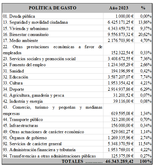 El presupuesto total del Ayuntamiento para 2023 asciende a 46.343.289 euros, con un aumento del 2,68 % respecto a las cuentas del año 2022. Para 2023 se mantiene la suspensión de la regla de gasto y otras reglas fiscales. Esto, unido a la solvente posición económica del Ayuntamiento y no tener deuda financiera, permitirá, una vez practicada la liquidación del ejercicio 2022, aplicar, vía modificación de crédito, el remanente de tesorería para gastos generales. Por tanto, pese a que el documento económico contempla una reducción del dinero destinado a inversiones (para poder hacer frente al gasto energético, que se ha triplicado) la realidad es que en 2023 el Ayuntamiento dispondrá de más fondos que en 2022 para este capítulo.