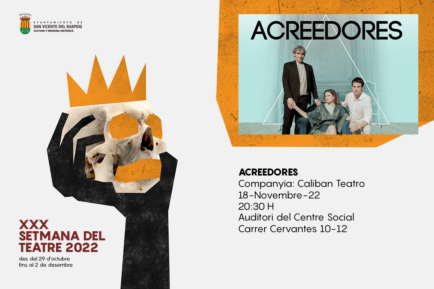 La compañía Calibán Teatro pone en escena el próximo viernes, 18 de noviembre, ‘Acreedores’, de Strindberg. Se trata de la quinta representación de las siete obras programadas en la XXX edición de la Semana del Teatro. Será en el Auditorio Municipal, a las 20.30 horas. Las entradas gratuitas pueden solicitarse en el email eventoscultura@raspeig.org (un máximo de dos por persona).