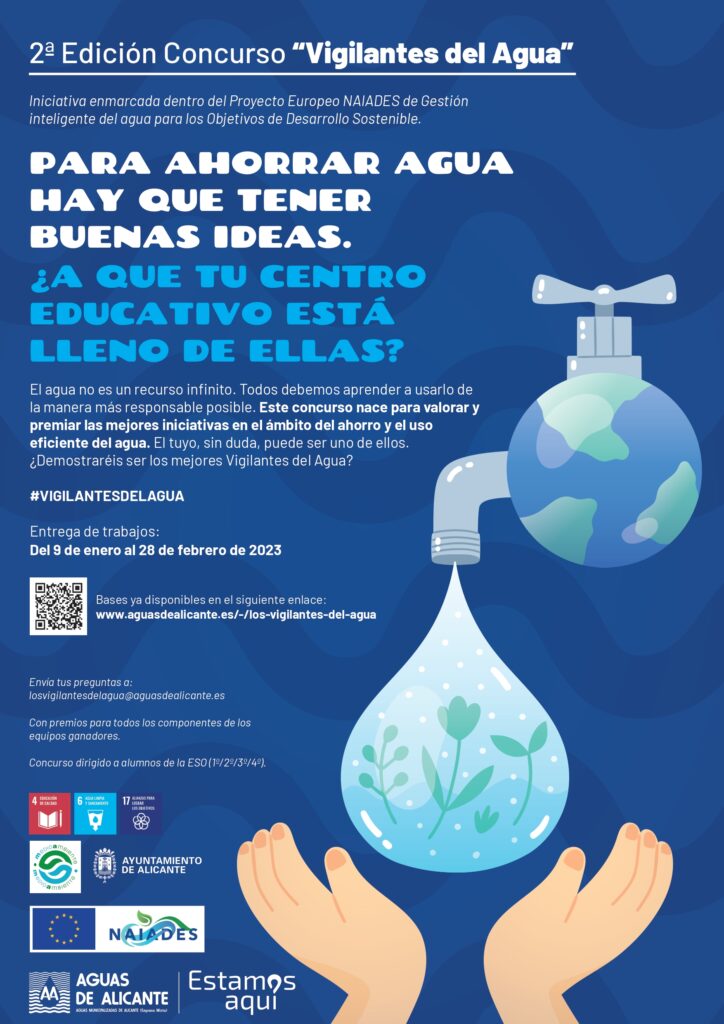 Aguas de Alicante ha lanzado recientemente la segunda convocatoria del concurso “Vigilantes del agua”, una iniciativa que tiene el objetivo de fomentar el uso eficiente del agua, potenciando la sensibilización medioambiental en el entorno escolar a través de la adopción de nuevos hábitos cotidianos, así como el conocimiento de la forma en la que consumimos el agua. “Vigilantes del agua” se enmarca en el Proyecto Europeo H2020 NAIADES del que forma parte la empresa, cuenta con la colaboración de la Concejalía de Medio Ambiente del Ayuntamiento y se suma al compromiso de Aguas de Alicante con la educación ambiental y el uso eficiente de los recursos hídricos, fundamental en un contexto marcado por una creciente escasez global de agua.