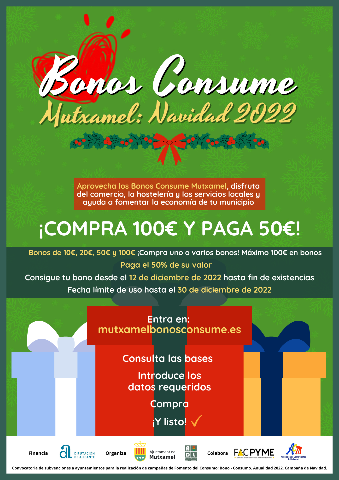 Una vez más, Mutxamel pone en marcha los Bonos Consume, una campaña de apoyo a las empresas y el comercio local, orientada en esta ocasión a las compras navideñas. Del 12 al 30 de diciembre de 2022, la ciudadanía podrá hacer uso de esta campaña de descuentos en comercios locales, que generará un impacto en ventas superior a 267.000 euros a lo largo del mes de diciembre. Los Bonos Consume permiten al comprador adquirir productos a mitad de precio, mientras que el vendedor logra incrementar sus ventas mientras se beneficia de las ayudas concedidas por el Ayuntamiento de Mutxamel y la Diputación de Alicante.