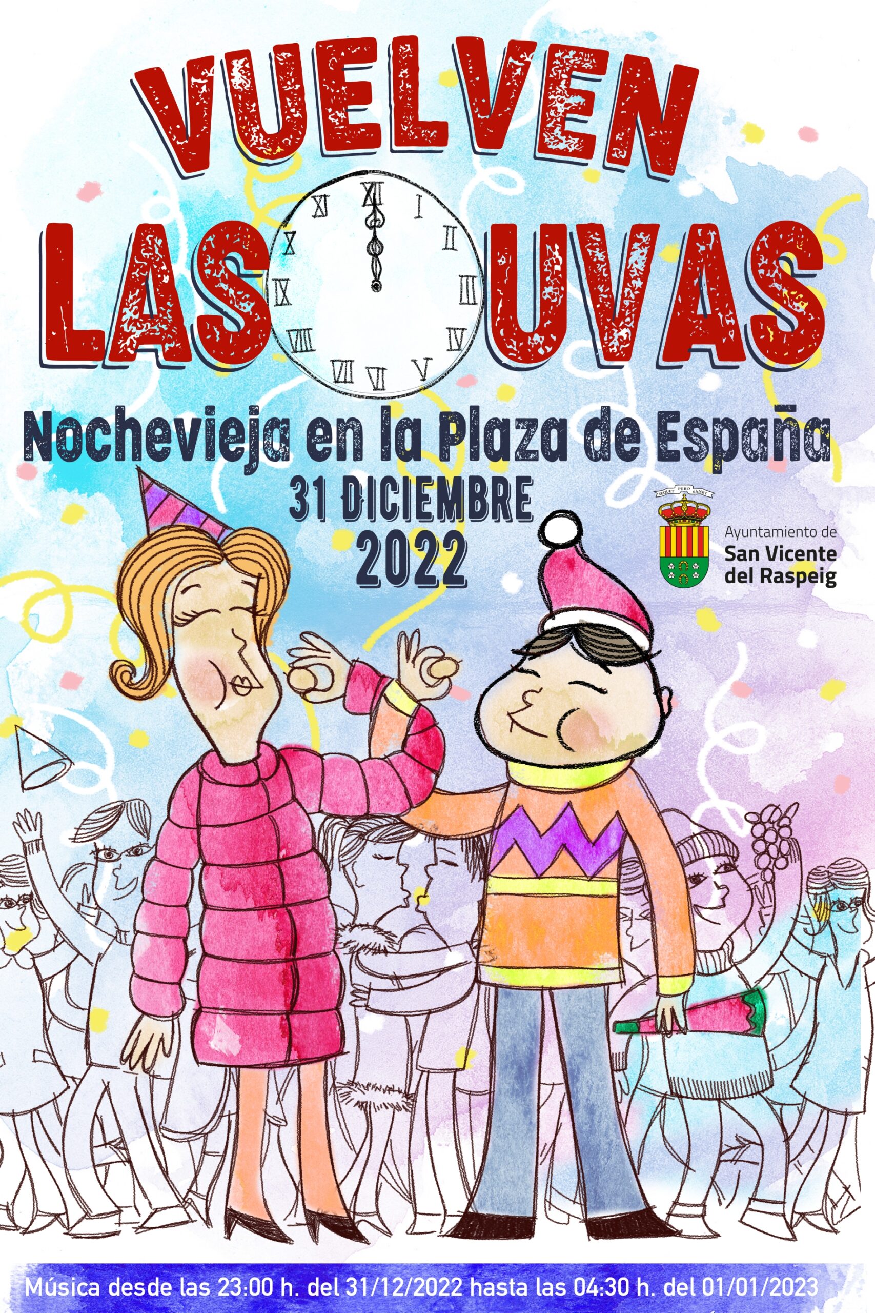 Este año, 2022, el reloj de la Iglesia San Vicente Ferrer situado en plaza de España, recupera las doce campanadas con público tras la pandemia. La Concejalía de Fiestas ha programado música para recibir el año nuevo desde las 23:00 horas del 31 de diciembre de 2022 y hasta la 4:30 horas del 1 de 2023. Además reparte entre los asistentes un millar de bolsas de cotillón.