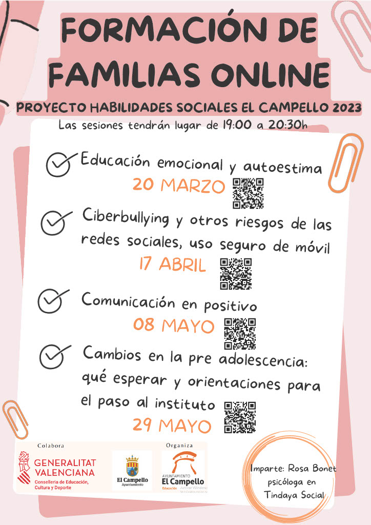 Programado por la concejalía de Educación que dirige Dorian Gomis, del 20 de abril al 31 de mayo se desarrollará de nuevo un taller de autoestima saludable para niños y niñas, titulado “Educar con corazón”. La actividad comenzará el día 20 n el colegio público Rafael Altamira, en horario lectivo, y finalizará el 31 de mayo en el centro Fabraquer.