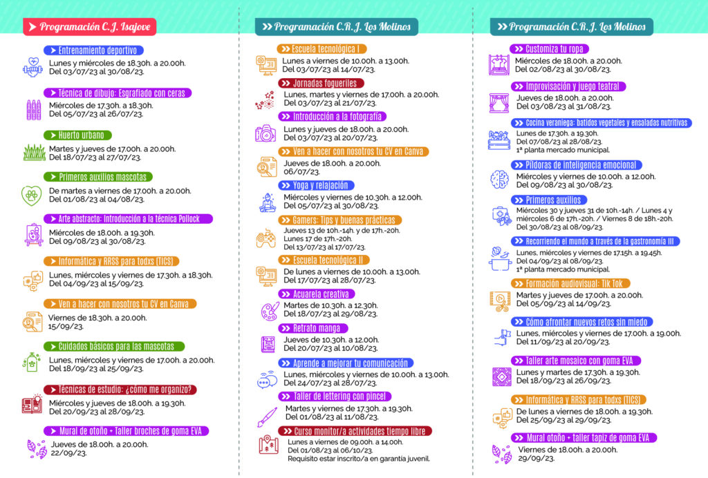 La Concejalía de Juventud del Ayuntamiento de San Vicente del Raspeig presenta un variado programa de actividades los meses de julio, agosto y septiembre, que acogerá el Centro de Recursos Juvenil Los Molinos y el Centro Juvenil Isajove. En total se ha programado una treintena de iniciativas, entre cursos, talleres y actividades, que se celebrarán de lunes a viernes en horario de mañana y tarde.