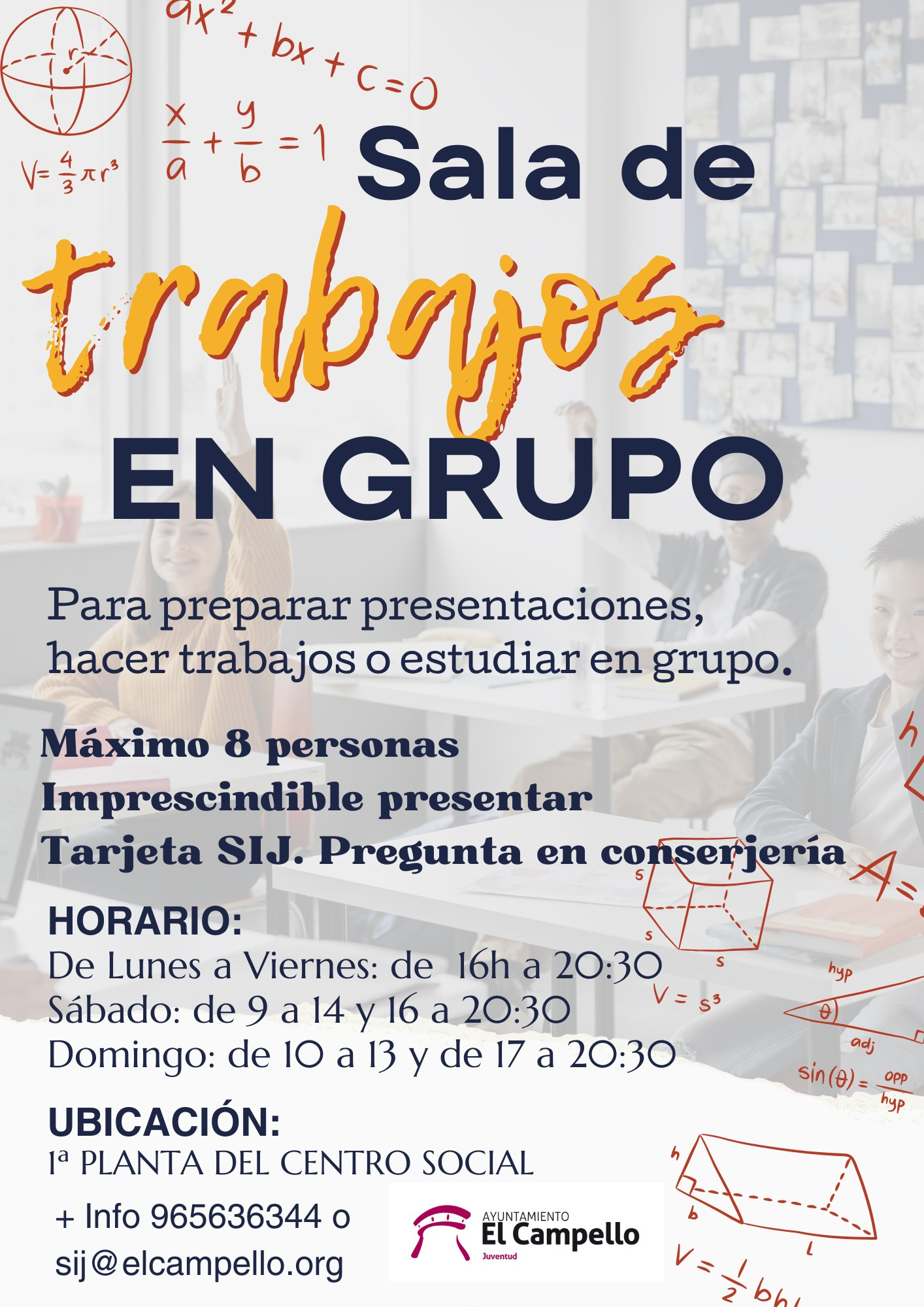 La acción va dirigida a aquellas personas que necesiten hacer un trabajo en grupo y no tengan lugar al que acudir. El acceso, es muy sencillo, hay que presentarse en el lugar y enseñar la tarjeta SIJ a Conserjería y solicitar que te abran la Sala, que se localiza en la primera planta del Centro Social El Barranquet. Se pide cuidar el mobiliario y la propia sala en general. Quien solicite el espacio firmará la entrada y salida como responsable.