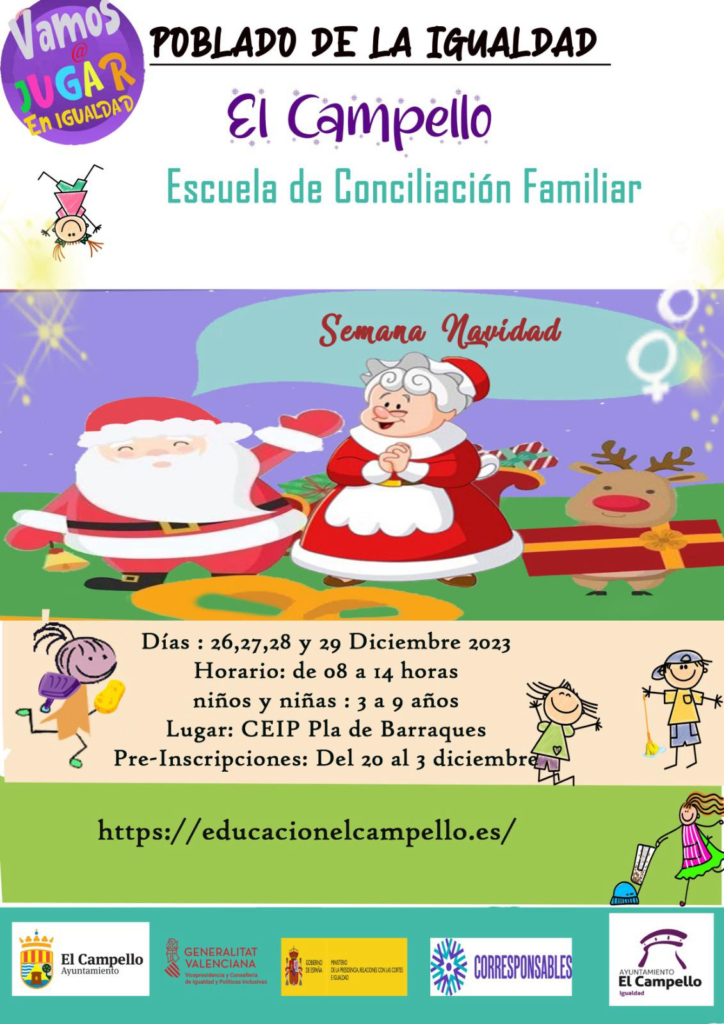 La concejalía de Igualdad, por su parte, oferta el “Poblado de la igualdad”, que se desarrollará en esta ocasión, también del 26 al 29 de diciembre, en las instalaciones del colegio público Pla Barraques para pequeños de 3 a 9 años.