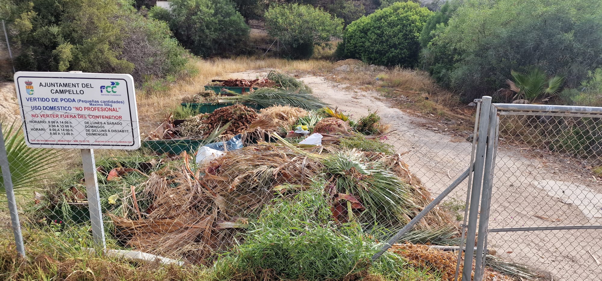 Hace tiempo que se viene detectando la anomalía, a la que se va a intentar poner freno de forma definitiva. Los puntos verdes de recogida de poda ubicados en distintas zonas del término municipal de El Campello son de uso exclusivo de particulares, y no espacios para que empresas especializadas en jardinería depositen allí restos ahorrándose el dinero que les costaría trasladarlos a lugares especialmente habilitados para ello.