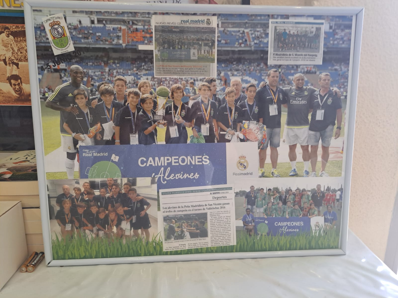 Cuando se vive una experiencia como esta, se descubre un mundo nuevo, que hasta entonces en nuestra PEÑA MADRIDISTA SAN VICENTE DEL RASPEIG, con más de 28 años de historia, no podíamos ni imaginar. Porque si es una hermosa aventura como hicimos en el TORNEO DE PEÑAS REAL MADRID DE 2015, en éste, conseguir ser CAMPEONES, y recibir las MEDALLAS EN LA CIUDAD REAL MADRID, DE MANOS DEL PRESIDENTE FLORENTINO PEREZ, SI ES UN SUEÑO VIVIDO. Y después en el santuario del estadio SANTIAGO BERNABÉU , recibir en el césped en los prolegómenos del partido de VETERANOS REAL MADRID y VETERAN0S DEL AJAX DE AMSTERDAN, de manos de los jugadores ROBERTO CARLOS y de CLARENCE SIDORF , EL TROFEO DE CAMPEONES es algo mágico, y que pone en valor que a A VECES LOS SUEÑOS SE CUMPLEN. Pero está claro, que hay que luchar con fe hasta el final, dando lo mejor de nosotros mismos como ENTIDAD, COMO FAMILIA, Y EN CONCLUSION COMO EQUIPO.