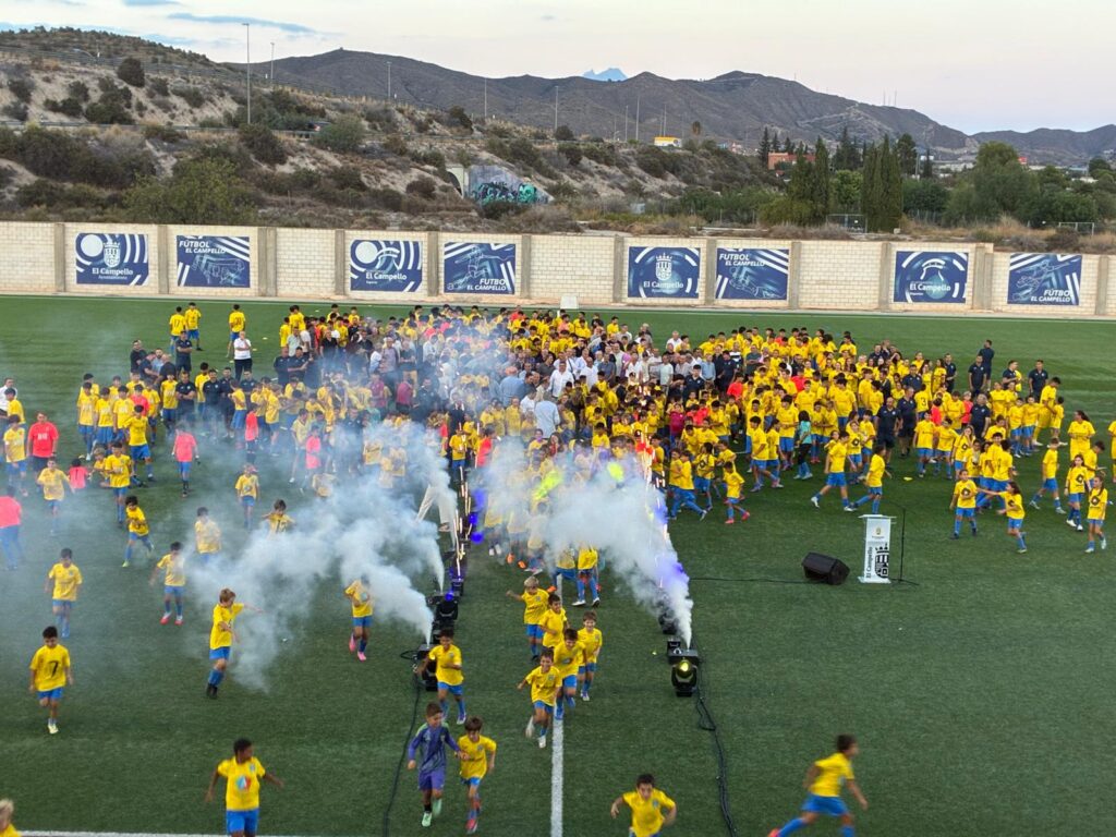 Se trató de un espectáculo que resultó tan emotivo como ágil, con un maestro de ceremonia (Big Mike) que fue dando paso, uno a uno, a los 32 equipos masculinos y femeninos que integran el club, hasta formar una gran familia de 600 futbolistas, acabando con los componentes del primer equipo, precedidos por los pequeños prebenjamines integrantes de la Academia Félix Palomares y, muy aplaudidos, la plantilla de la “escoleta”, cogidos de la mano e ilusionados con las bengalas y columnas de humo que formaban en el rectángulo un pasillo que tenían que atravesar.