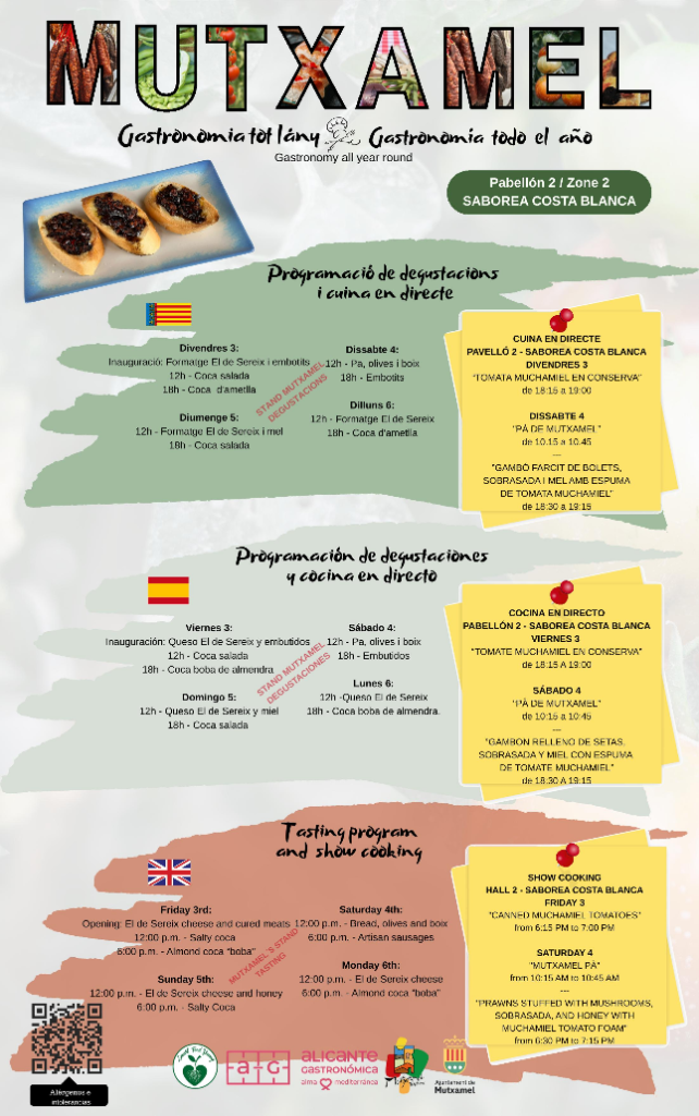 Mutxamel estará presente del 3 al 6 de octubre de 2025 en la VII Feria Alicante Gastronómica, su stand (número 16) estará ubicado dentro del espacio Saborea Costablanca (Pabellón 2), para mostrar la riqueza de su patrimonio culinario a través de talleres, showcookings, degustaciones y nuevas iniciativas promocionales. Con el lema “Mutxamel, gastronomía tot l’any”, el municipio invita a descubrir la esencia de la huerta alicantina y sus productos más emblemáticos, entre los que destaca el Tomate Muchamiel, símbolo de identidad y calidad reconocido con la ‘Marca CV’.