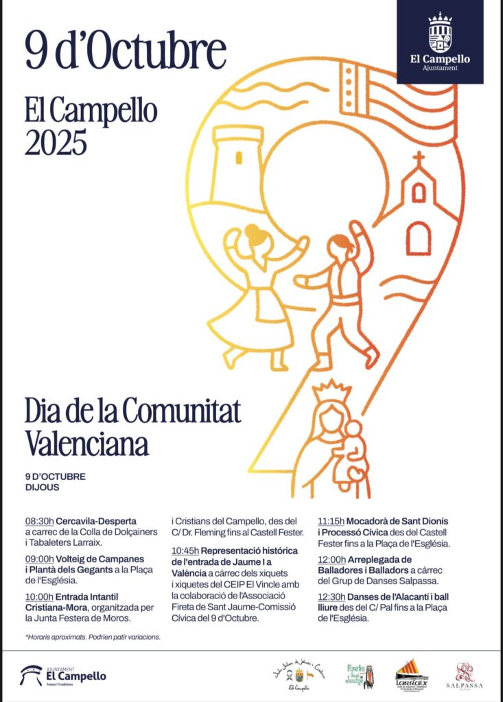 Y todos ellos tienen sus protagonistas, con nombre propio. Como el 9 d’Octubre, para el que la concejalía de Fiestas y Tradiciones del Ayuntamiento, la Junta Festera de Moros y Cristianos, la Colla Larraix, el Grup de Danses Salpassa y la Fireta Sant Jaume han dado forma a una programación que arrancará a las 8:30 horas y finalizará al mediodía.