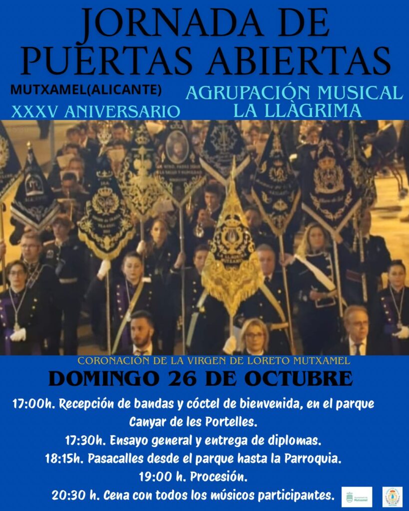 Mutxamel se prepara para vivir una jornada muy especial con motivo del XXXV Aniversario de la Agrupación Musical La Llàgrima, que tendrá lugar el domingo 26 de octubre. El evento, enmarcado dentro de la Coronación de la Virgen de Loreto, reunirá a destacadas agrupaciones musicales de distintos puntos de la Comunidad Valenciana, Murcia y Castilla-La Mancha.