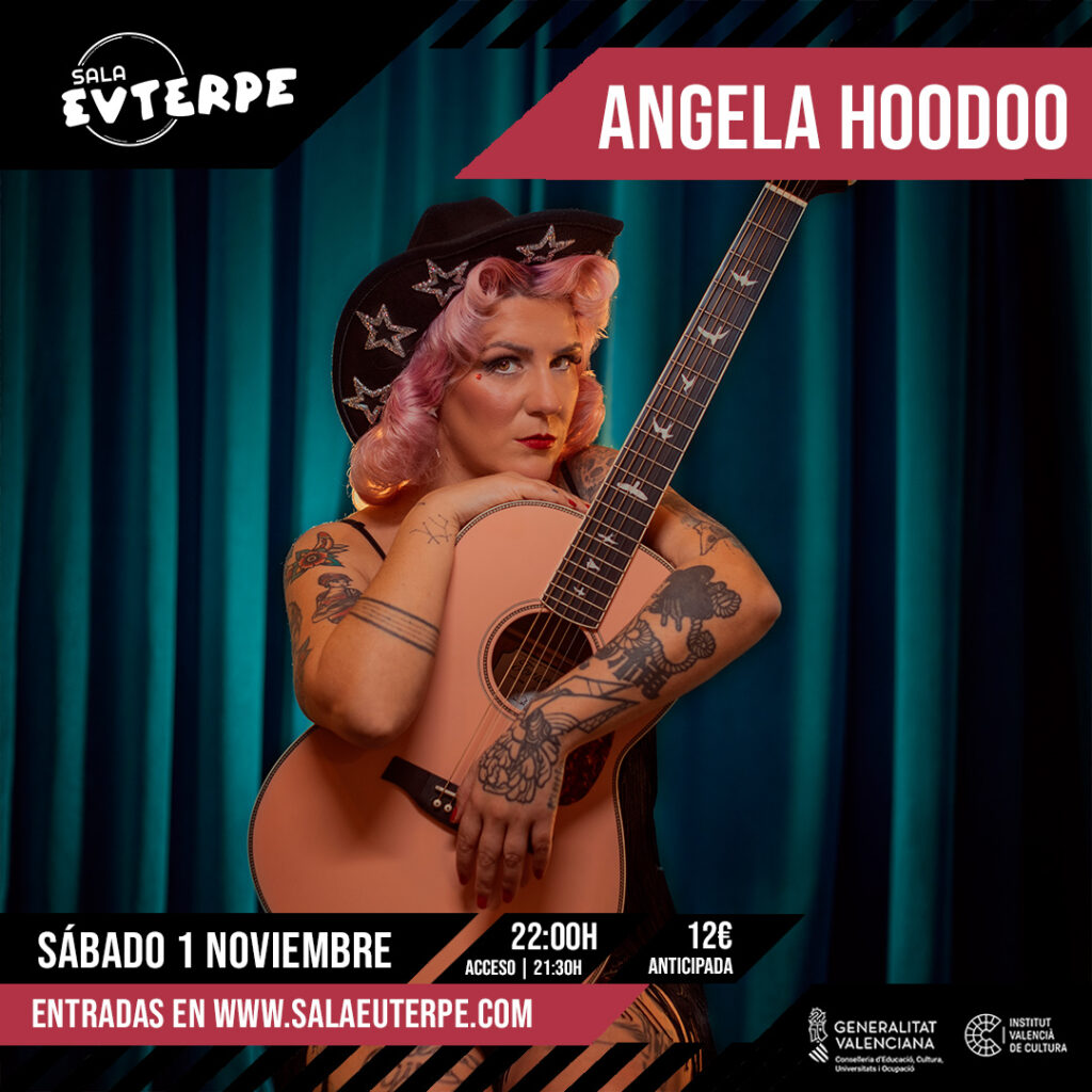 El sábado 1 de noviembre a las 22h, se sube al escenario de Euterpe Angela Hoodoo. Artista que se ha consagrado a día de hoy como una de las artistas más influyentes del panorama nacional de la música de raíz americana. Cantante, compositora, y guitarrista granadina, con una larga trayectoria a sus espaldas militando en bandas de Punk/Rock (A.C.A.B.A.D.A.S., Granada) y Blues (Blue Bloody Blades, Barcelona) entre otras; su repertorio actual se hunde de lleno en los géneros outlaw country, americana, rhythm & blues, western swing, blues o rockabilly,con una puesta en escena irresistible junto a su fiel banda formada por músicos de la escena malagueña, dónde reside actualmente y formó el proyecto. Tras la publicación de su álbum debut “Coyote” en 2023 (FOLC Records) y tras una extensa gira que la ha llevado por salas de renombre de prácticamente todo el país y por festivales de la talla de Rockin Race Jamboree o Huercasa Country Festival, la cantante se ha hecho con un nombre más que merecido dentro de la escena actual donde la aceptación del público, de la crítica musical y la prensa, han sido indiscutibles. Su frescura y originalidad aportan algo muy necesario y poco habitual: un sonido y producción musical actuales en géneros de tipo vintage y ninguna pretensión de imitar a los clásicos aunque beba de sus raíces; Angela tiene una personalidad arrolladora, unas tablas en el escenario más que evidentes, una voz hipnotizante y unas composiciones de 10. Angela Hoodoo vuelve a sorprendernos; viene con paso firme este 2025 y con el calibre bien engrasado con su segundo disco de estudio: “Outlaw Girls”, un 10’’ con siete cortes bien afilados, producido por el músico malagueño Pablo Fugitivo, grabado, mezclado y masterizado en Hollers Analog Studio por Maxi Bandera ( ya en su anterior LP contó con el mismo equipo) y bajo el sello discográfico malagueño Sleazy Records.