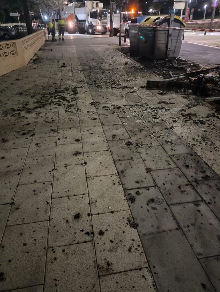 Pocas horas después, la con cesionaria del servicio de limpieza viaria, FCC, despejó la zona de restos calcinados y repuso los contenedores.