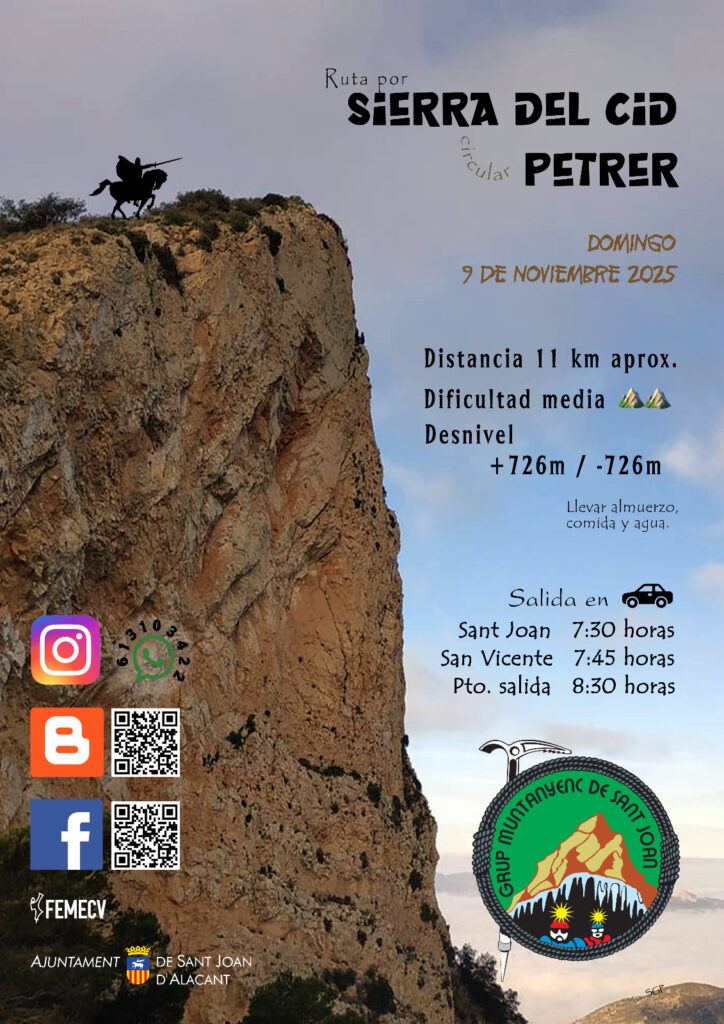 El Grup Muntanyenc de Sant Joan (GMSJ) ha anunciado su próxima salida de senderismo, que tendrá lugar el domingo 9 de noviembre, con destino a la Serra del Cid, una de las sierras más emblemáticas del interior alicantino.