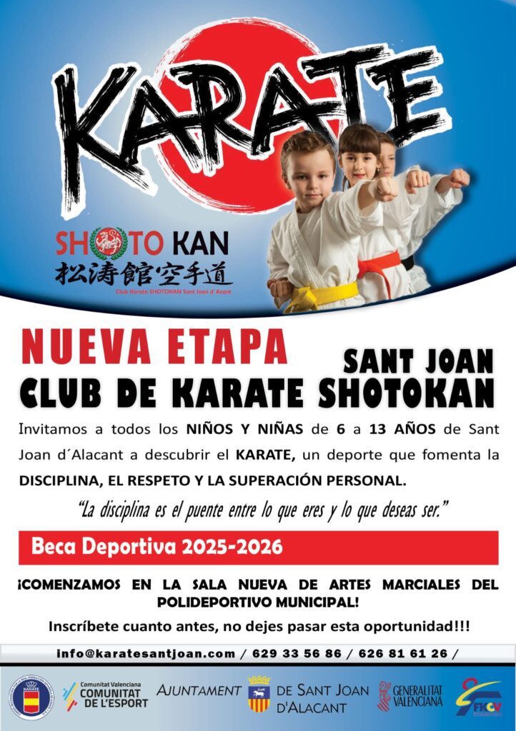 El Club de Karate Shotokan Sant Joan d’Alacant ha anunciado una beca deportiva dirigida a niños y niñas de 6 a 13 años con talento, energía y ganas de superarse. Esta iniciativa, que se desarrollará entre noviembre de 2025 y mayo de 2026, busca consolidar el éxito reciente del club, cuyos alumnos han cosechado importantes logros en diversos campeonatos.