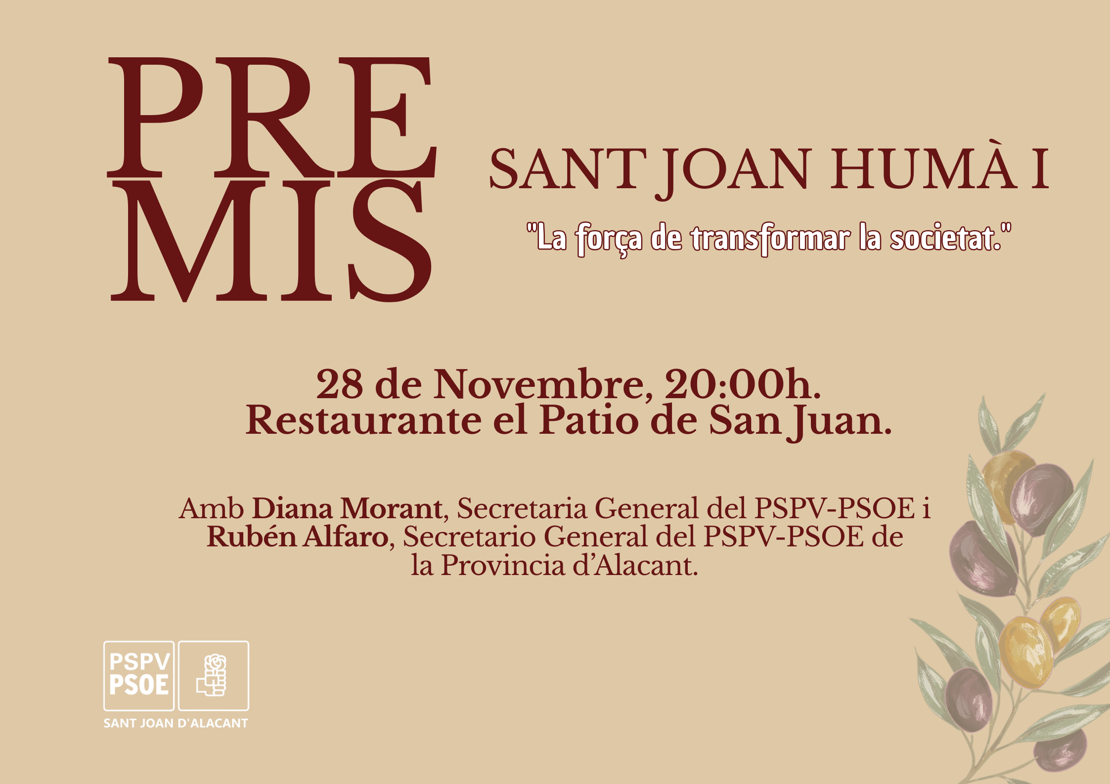 El PSPV-PSOE de Sant Joan d’Alacant celebrará el próximo viernes 28 de noviembre, a las 20:30 horas en el Restaurante El Patio, la I Edición de los Premis Sant Joan Humà, unos galardones creados con el objetivo de reconocer y visibilizar aquellos proyectos, entidades y personas que trabajan cada día por construir un municipio más solidario, inclusivo, igualitario, diverso y humano.