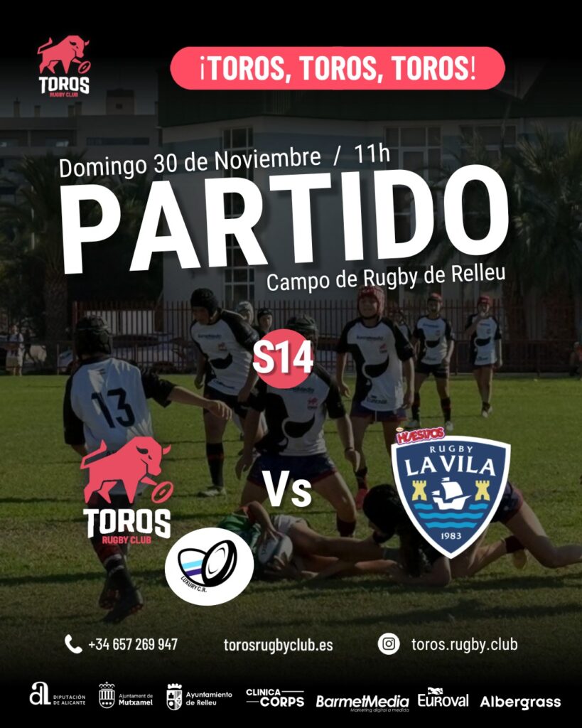 El domingo 30 de noviembre a las 11:00 h, el equipo S14 del Toros Rugby Club disputará un emocionante encuentro frente al Rugby La Vila en el Campo de Rugby de Relleu.