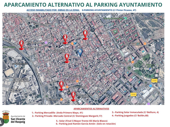 Como alternativas de estacionamiento, el Ayuntamiento remite a otros seis espacios operativos: el parking rotativo Ingeniero José Ramón García Antón; el aparcamiento del Mercadillo (Avda. Primero de Mayo, 41); el del Mercado Central (C/ Domínguez Margarit, 17); el solar de la Inmaculada (C/ Benlliure, 4); el parking de los Juzgados (C/ Bailén, 68) y el solar frente al IES María Blasco (C/ Mayor).