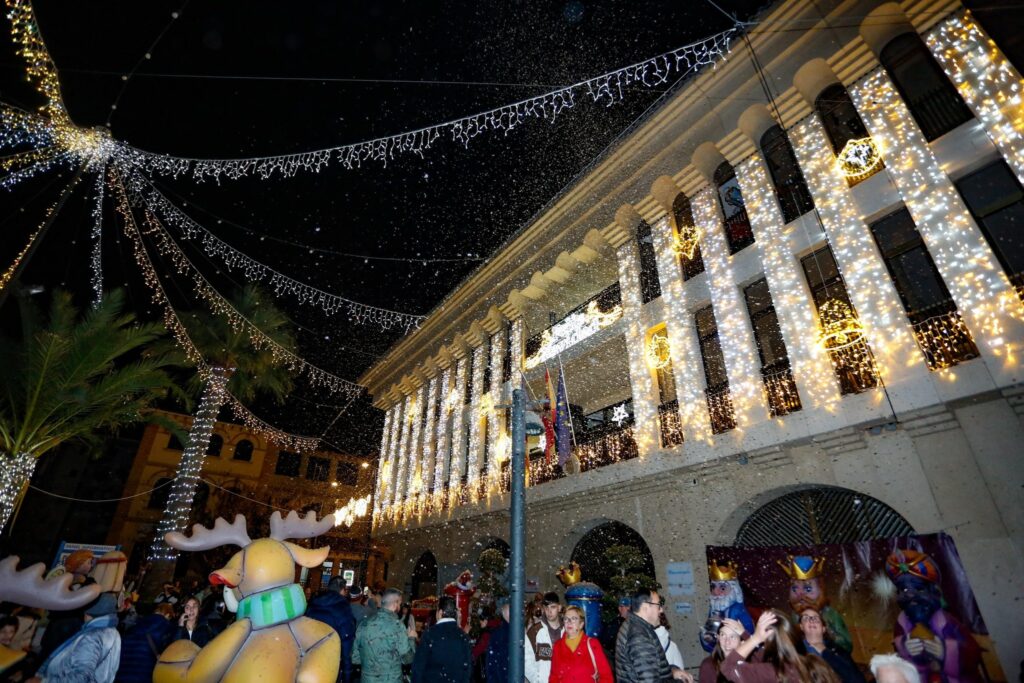 El alcalde, Santiago Román, junto a miembros de la corporación municipal y representantes de las entidades festeras locales, encabezó la cuenta atrás que fue coreada por todo el público presente. En el momento del encendido, una sorprendente nevada artificial cayó frente a las puertas del Ayuntamiento, desatando la ilusión entre las familias que llenaban la plaza. Niños y adultos disfrutaron de un ambiente plenamente navideño.