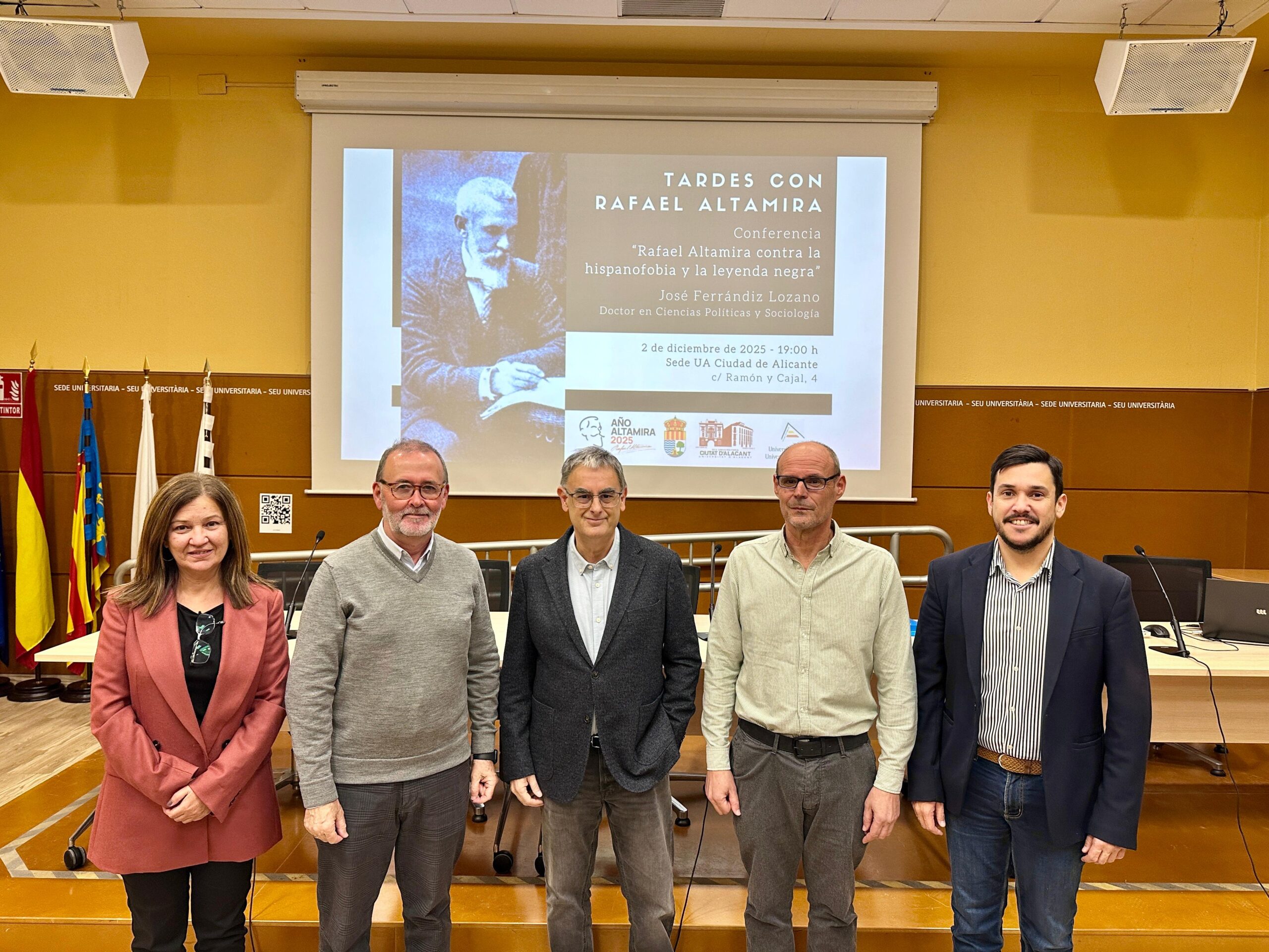 “Rafael Altamira contra la hispanofobia y la leyenda negra”. Es el título de la conferencia que ayer impartió en la sede de la Universidad de Alicante en la capital el doctor en Ciencias Políticas y Sociología José Ferrándiz Lozano. Se trataba del último acto académico organizado por la UA parra sumarse al “Año Altamira” promovido por el Ayuntamiento de El Campello, que estuvo representado en el acto por el alcalde, Juanjo Berenguer, y los concejales Dorian Gomis y Cristian Palomares, que compartieron espacio con decenas de personas que finalmente acabaron por llenar el salón de actos.