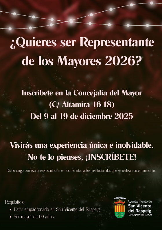 Del 9 al 19 de diciembre de 2025, las personas mayores de 60 años empadronadas en San Vicente podrán inscribirse en la Concejalía del Mayor (C/ Altamira 16-18) para optar a este cargo honorífico, que implica participar en actos institucionales y vivir, tal como destaca el propio cartel informativo, “una experiencia única e inolvidable”. Desde el área que dirige Iborra se anima a los mayores a formar parte activa del tejido social del municipio, reforzando su visibilidad y su aportación comunitaria.